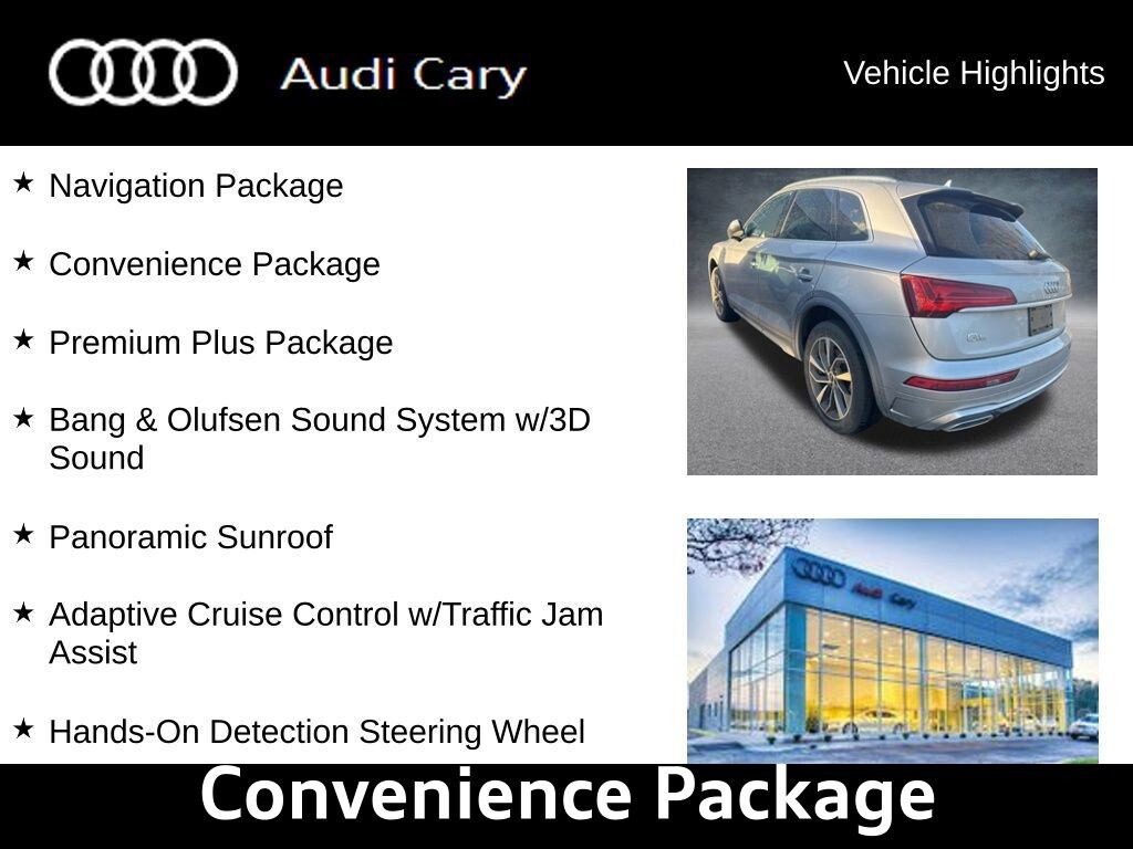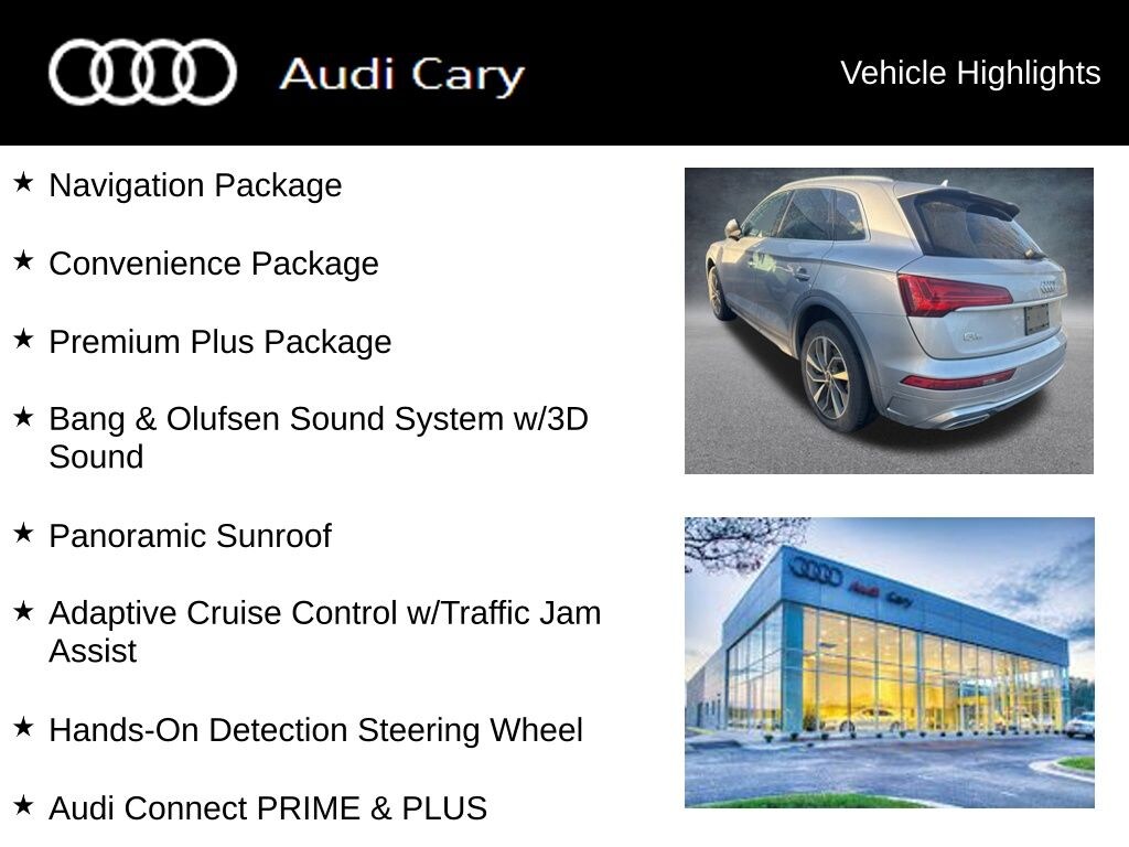 Florett Silver Metallic 2022 Audi Q5 45 S line Premium Plus quattro 7-Speed Automatic S tronic 2.0L Turbocharged quattro CARFAX One-Owner. Rock Gray w/Leather Seating Surfaces, Adaptive Cruise Control w/Traffic Jam Assist, Audi Active Lane Assist, Audi Connect PRIME & PLUS, Audi Phone Box, Audi Virtual Cockpit Plus, Bang & Olufsen Sound System w/3D Sound, Convenience Package, Hands-On Detection Steering Wheel, Leatherette Covered Center Console & Door Armrests, MMI Navigation Plus, Navigation Package, Panoramic Sunroof, Power Adjustable Steering Column, Premium Plus Package, Top View Camera System, Wheels: 19" 5-Double-Arm Design Bi-Color Finish.
