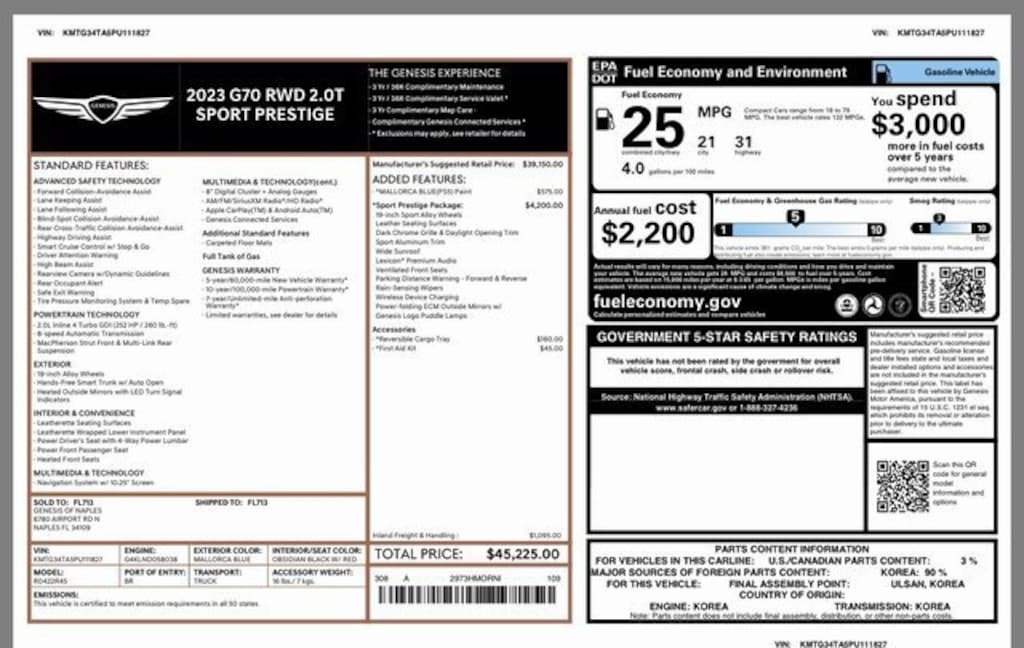 CARFAX One-Owner. 2023 Genesis G70 2.0T 8-Speed Automatic with SHIFTRONIC I4