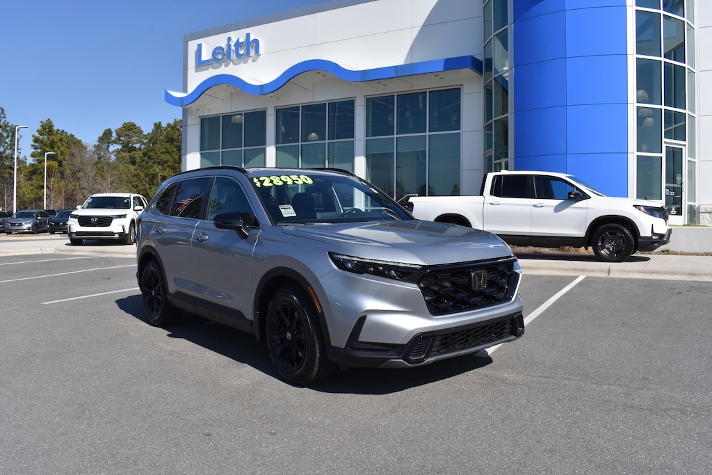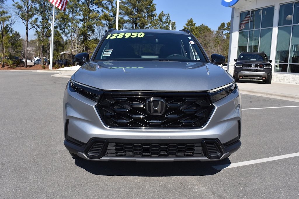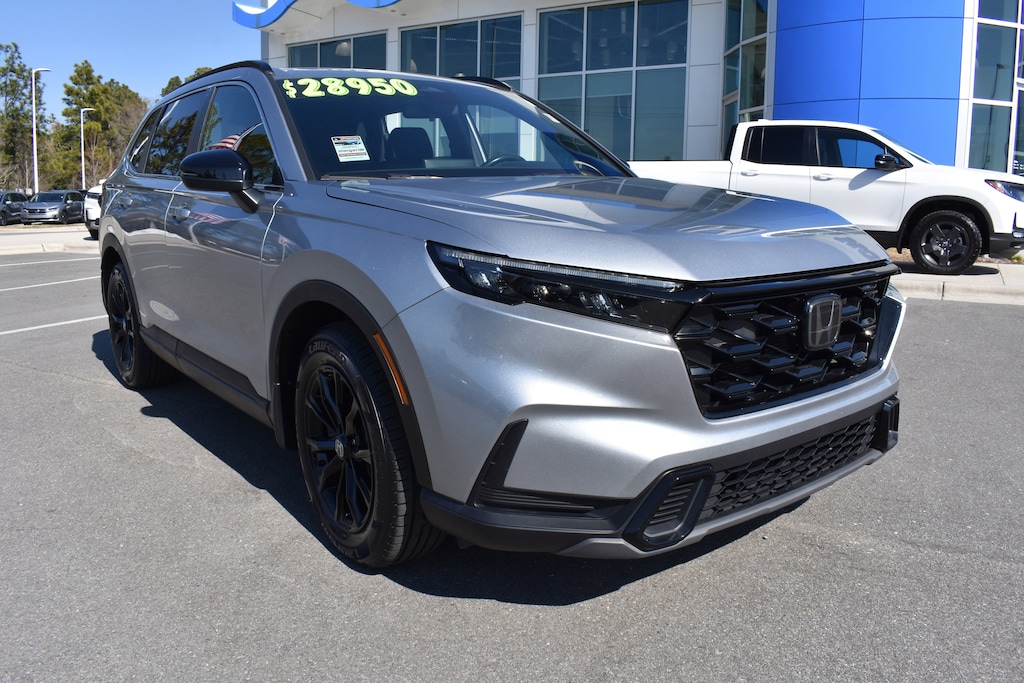 Clean CARFAX. Certified. Lunar Silver Metallic 2023 Honda CR-V Hybrid Sport FWD eCVT 2.0L I4 DOHC 16V 4-Wheel Disc Brakes, 4.438 Axle Ratio, 6 Speakers, ABS brakes, Adaptive Cruise Control: Adaptive Cruise Control (ACC) with Low-Speed Follow, Air Conditioning, Alloy wheels, Apple CarPlay/Android Auto, Auto High-beam Headlights, Automatic temperature control, Brake assist, Bumpers: body-color, Cloth Seat Trim, Compass, Delay-off headlights, Dual front impact airbags, Dual front side impact airbags, Electronic Stability Control, Exterior Parking Camera Rear, Four wheel independent suspension, Front anti-roll bar, Front dual zone A/C, Fully automatic headlights, Heated door mirrors, Heated Front Bucket Seats, Heated front seats, Illuminated entry, Knee airbag, Leather Shift Knob, Leather steering wheel, Low tire pressure warning, Occupant sensing airbag, Overhead airbag, Overhead console, Panic alarm, Power door mirrors, Power driver seat, Power moonroof, Power steering, Power windows, Radio data system, Radio: 240-Watt AM/FM Audio System, Rear anti-roll bar, Rear seat center armrest, Rear side impact airbag, Rear window defroster, Rear window wiper, Remote keyless entry, Security system, Speed control, Speed-sensing steering, Speed-Sensitive Wipers, Split folding rear seat, Spoiler, Steering wheel mounted audio controls, Telescoping steering wheel, Tilt steering wheel, Traction control, Trip computer, Turn signal indicator mirrors, Variably intermittent wipers, Wheels: 18" Berlina Black Alloy.