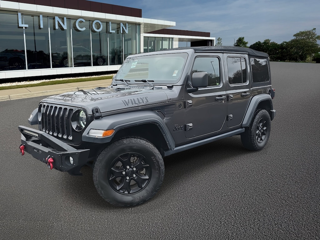 Granite Crystal Metallic Clearcoat 2021 Jeep Wrangler Unlimited Willys 4WD 8-Speed Automatic 2.0L I4 DOHC 240 Amp Alternator, 4-Wheel Drive Swing Gate Decal, 7 & 4 Pin Wiring Harness, 7.0" Touchscreen Display, 700 Amp Maintenance Free Battery, 8.4" Radio & Premium Audio Group, Air Conditioning w/Auto Temperature Control, Air Filtering, Alpine Premium Audio System, Anti-Spin Differential Rear Axle, Apple CarPlay, Auto-Dimming Rear-View Mirror, Automatic Headlamps, Auxiliary Switches, Black Grille, Black Trail Rated Badge, Blind Spot & Cross Path Detection, Class II Receiver Hitch, Cluster 7.0" TFT Color Display, Convenience Group, Deep Tint Sunscreen Windows, Emergency/Assistance Call, Front 1-Touch Down Power Windows, Google Android Auto, GPS Antenna Input, Injection Molded Black Rear Bumper, Integrated Center Stack Radio, Leather Wrapped Steering Wheel, LED Headlamp & Fog Lamp Group, LED Taillamps, Matte Black Jeep Badge, Mold In Color Bumper w/Gloss Black, MOPAR All-Weather Floor Mats, ParkSense Rear Park Assist System, Power Heated Mirrors, Premium Black Sunrider Soft Top, Quick Order Package 22W Willys, Radio: Uconnect 4 w/7" Display, Remote Keyless Entry, Safety Group, Security Alarm, SiriusXM Satellite Radio, Speed Sensitive Power Locks, Sun Visors w/Illuminated Vanity Mirrors, Technology Group, Trailer Tow & HD Electrical Group, Universal Garage Door Opener, USB Host Flip, Wheels: 17" x 7.5" Moab Black Aluminum, Willys, Willys Hood Decal, Wrangler Decal.