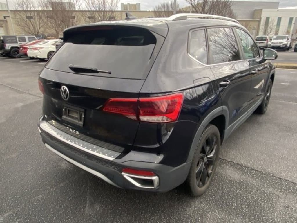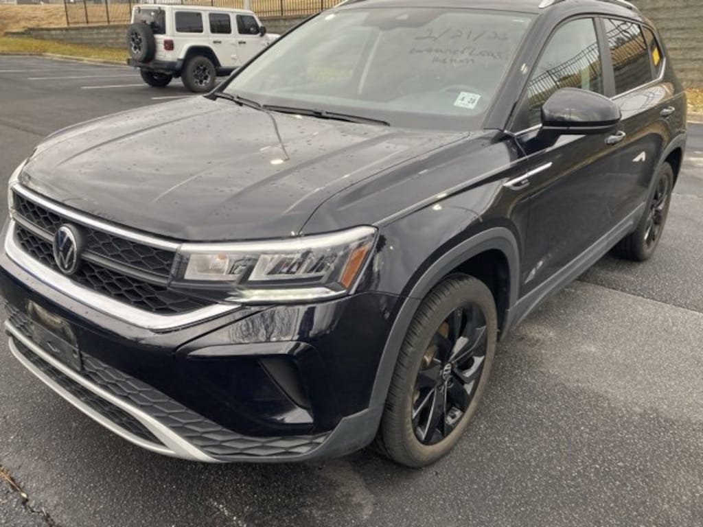Deep Black 2023 Volkswagen Taos 1.5T SE FWD 8-Speed Automatic with Tiptronic 1.5L I4 Turbocharged DOHC 16V LEV3-SULEV30 158hp Non-Smoker, 3.23 Axle Ratio, Air Conditioning, Auto High-beam Headlights, Brake assist, CloudTex & Cloth Seating Surfaces, Delay-off headlights, Electronic Stability Control, Emergency communication system: VW Car-Net Safe & Secure 5-year, Exterior Parking Camera Rear, Fully automatic headlights, Heated Front Comfort Seats, Power driver seat, Radio: MIB3 Composition Media AM/FM/HD, Rain sensing wipers, Rear window wiper, Remote keyless entry, Split folding rear seat, Steering wheel mounted audio controls, Wheels: 18" Black Painted Alloy.