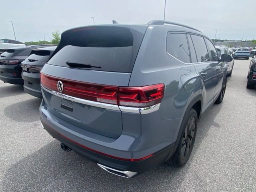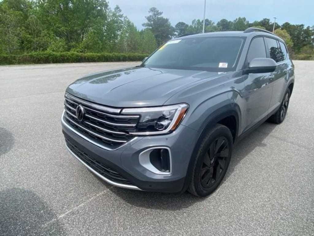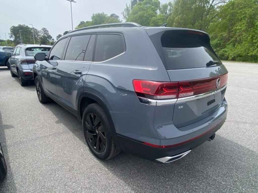 Pure Gray 2025 Volkswagen Atlas 2.0T SE w/Technology FWD 8-Speed Automatic 2.0L TSI 20" multi-spoke black painted alloy wheels, 2nd-row dual captain's chairs, 3rd row seats: split-bench, AM/FM radio: SiriusXM with 360L, Auto High-beam Headlights, Automatic temperature control, black wheel package, Brake assist, Electronic Stability Control, Exterior Parking Camera Rear, Four wheel independent suspension, Front dual zone A/C, Front fog lights, Fully automatic headlights, Heated front seats, MIB3 composition media radio, Panoramic sunroof package, perforated V-Tex leatherette seating surfaces, Power driver seat, Power Liftgate, power tilting and sliding Panoramic sunroof, Rain sensing wipers, Rear air conditioning, Rear window wiper, Remote keyless entry, Speed-sensing steering, Split folding rear seat, Steering wheel mounted audio controls, Traction control, Ventilated front seats.