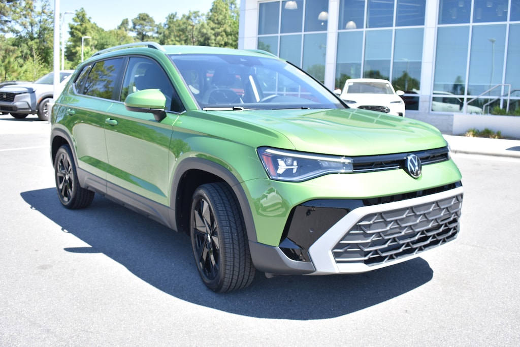 CARFAX One-Owner. Bright Moss Green Metallic 2025 Volkswagen Taos 1.5T SE FWD 8-Speed Automatic with Tiptronic 1.5L I4 Turbocharged DOHC 16V LEV3-SULEV30 174hp 4-Wheel Disc Brakes, 6 Speakers, ABS brakes, Active Blind Spot Monitor, Air Conditioning, Alloy wheels, AM/FM radio: SiriusXM with 360L, Auto High-beam Headlights, Automatic temperature control, Brake assist, Bumpers: body-color, Cloudtex and Cloth Seating Surfaces, Compass, Delay-off headlights, Dual front impact airbags, Dual front side impact airbags, Electronic Stability Control, Emergency communication system: VW Car-Net Safe & Secure 5-year, Exterior Parking Camera Rear, Front anti-roll bar, Front dual zone A/C, Front Strut Rear Torsion Beam Suspension, Front wheel independent suspension, Fully automatic headlights, Heated door mirrors, Heated Front Bucket Seats, Heated steering wheel, Illuminated entry, Leather Shift Knob, Low tire pressure warning, Occupant sensing airbag, Outside temperature display, Overhead airbag, Panic alarm, Passenger vanity mirror, Power door mirrors, Power driver seat, Power steering, Power windows, Radio data system, Radio: MIB3 Composition Media AM/FM/HD, Rain sensing wipers, Rear anti-roll bar, Rear window defroster, Rear window wiper, Remote keyless entry, Security system, Speed control, Speed-sensing steering, Spoiler, Steering wheel mounted audio controls, Tachometer, Telescoping steering wheel, Tilt steering wheel, Traction control, Trip computer, Variably intermittent wipers, Wheels: 18" 2-Tone Machined Alloy.